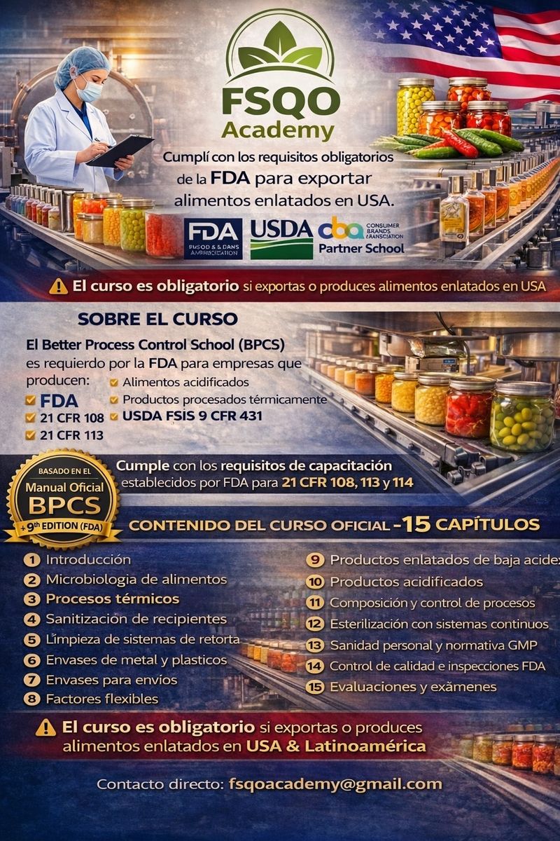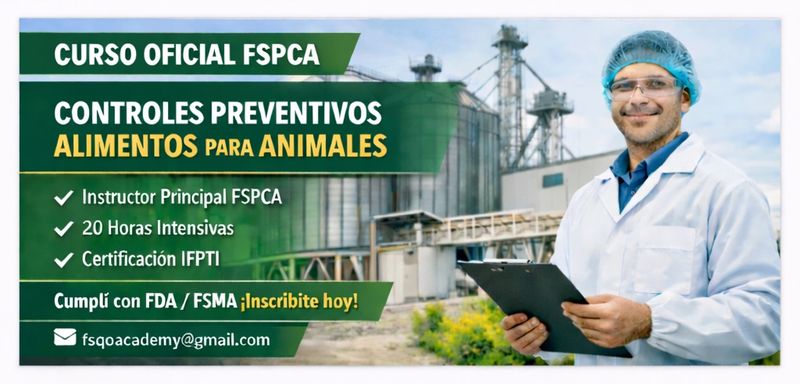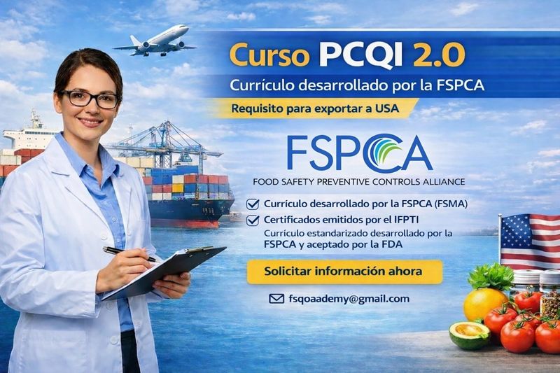 Curso oficial de PCQI 2.0 de la FSPCA sobre Controles Preventivos de Alimentos para Humanos de 24 horas de duración con certificados emitidos por el IFPTI.Costo total $399Proximo curso del 2 al 4 de junio de 2026Pagos por Paypal